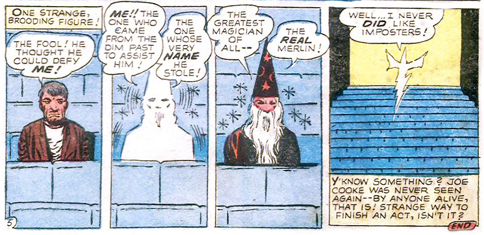 | 於亞瑟王時代擊敗他的冒名者Maha Yogi (aka Mad Merlin) 。 |